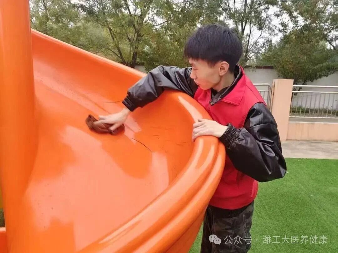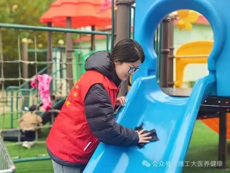 此外志愿者们还开启了幼儿园公共区域的清扫工作,仔细擦拭明亮的窗户、消毒游乐设施的扶手与边角,认真清理地面的杂物与灰尘。他们用双手为孩子们打造了整洁又安全的环境,让小朋友们能在干净舒心的空间里安心玩耍、快乐成长。