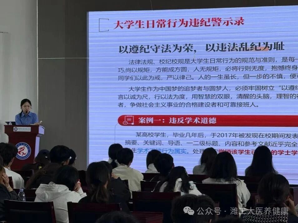 讲座中,老师结合了“大学生日常行为违纪警示录”的主题,通过典型案例,如某高校学生学术不端等情况,向台下学生深入剖析遵纪守法的重要性。大屏幕清晰展示着案例内容与法治理念,师生们专注聆听,现场氛围严肃且充满学习热情,大家都在认真汲取法律知识,感受法治精神对自身成长与校园和谐的关键意义。