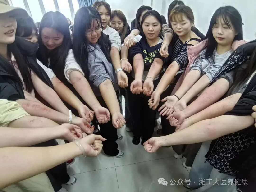 幼教同学热情高涨、跃跃欲试,在中医养生保健班专业学生的指导下,以多人自由组队的形式在同伴手臂上练习。现场氛围热烈,中医专业学生结合日常康养等实操经验,与幼教专业同学交流操作心得,帮助大家在调整力度与角度的尝试中,从最初的生疏逐渐变得熟练,真正掌握刮痧的规范要领。