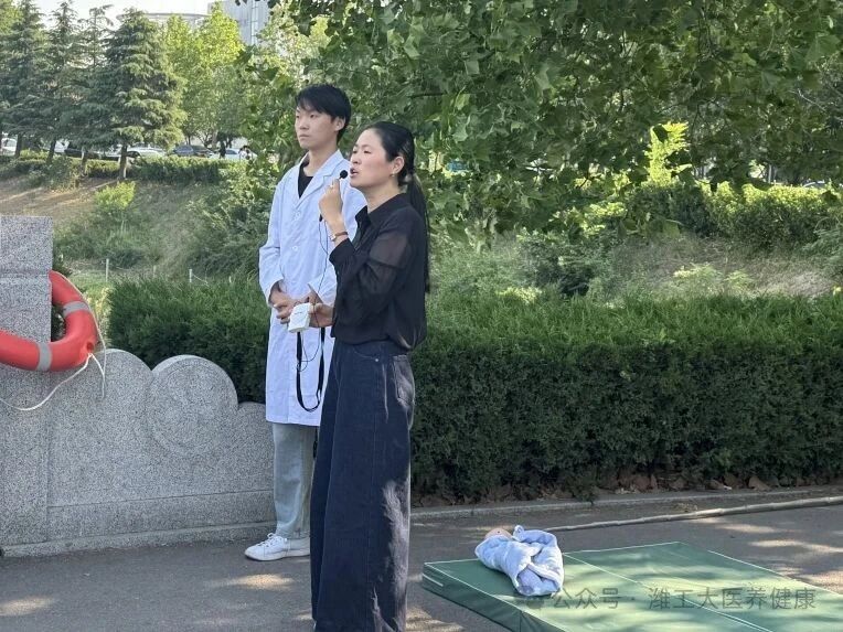 随后,在臧书记的引领下,全体同学有序移步至桥畔实践教学点。赵俊超同学作为急救技能示范代表,通过情景模拟与实操演示相结合的方式,系统讲解溺水风险防控要点,并规范展示心肺复苏术的操作流程,同时邀请同学实践,将理论知识转化为直观可感的实践教学,为同学们上了一堂生动的生命安全教育课