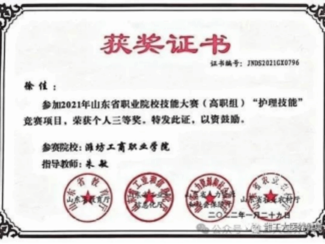 大赛点亮人生,技能成就梦想。护理专业狠抓技能大赛,以赛促学,提高了学生的技能水平。2021年参加山东省职业院校技能大赛高职组护理技能赛项获得三等奖。2024年山东省职业院校创新创业大赛高职组护理技能赛项获得二等奖一项,三等奖一项。
