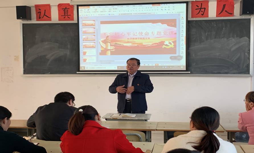 2019年11月15日下午,医养健康学院在党员活动室举行了“不忘初心、牢记使命”主题教育专题党课,王传旭院长亲临指导,党课由党支部书记柴元昌主讲,教工党员12人参加了党课。