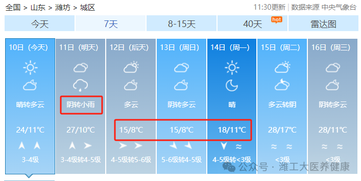 受强冷空气影响,预计11日夜间至14日潍坊市将出现大风降温天气过程。11夜间至13日风力较大,12—13日北风7~8级阵风9~10级,14日北风5~6级阵风7~8级。12—14日最低气温8~10℃,西南山区及低洼地带将降至4~6℃,有霜冻或轻霜冻。