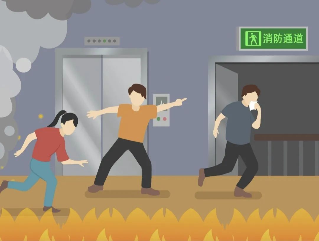 错误做法:乘坐电梯逃生。 正确做法:冷静观察着火方位,确定风向,在火势蔓延前,朝逆风方向快速离开火灾区域。浸湿衣物、被褥等向安全出口方向冲出去。不可乘坐电梯,应回忆消防通道位置或寻找消防通道指示牌,通过消防通道逃生。若发现外出逃生线路被封,应立即退回室内,用手电筒、呼叫等方式求救,千万不要盲目跳楼。 温馨提示:因为电梯不具有耐高温性,当遇到高温时,电梯容易发生变形甚至卡住,甚至还会有触电的危险。