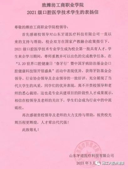 近日,医养健康学院收到了一封特别的表扬信。信中表扬了2021级口腔医学技术的学生们为“3.20世界口腔健康日‘春牙行’暨中国牙病防治基金会口腔健康科技馆开馆盛典”活动做出的突出贡献,对学院培养优秀人才做出的努力表示肯定和感谢。