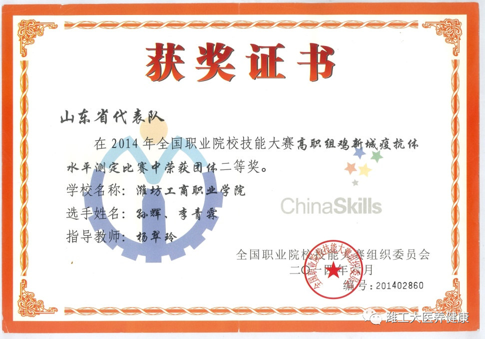 大赛点亮人生,技能成就梦想。畜牧兽医专业狠抓技能大赛,以赛促学,提高了学生的技能水平。2014年参加全国职业院校技能大赛“高职组鸡新城疫抗体水平测定”荣获团体二等奖。