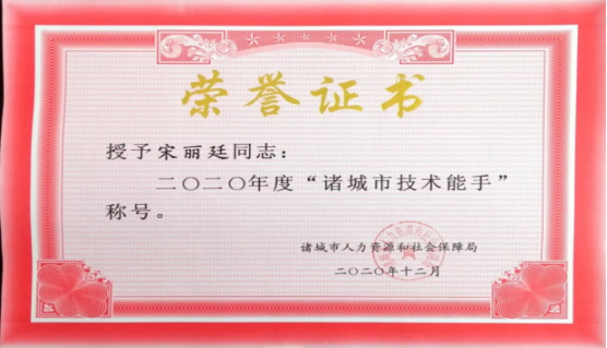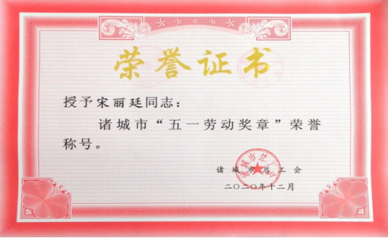 教师宋丽廷荣获一等奖,并被授予“诸城市技术能手”称号和“诸城市五一劳动奖章”。