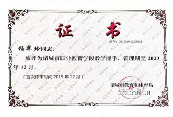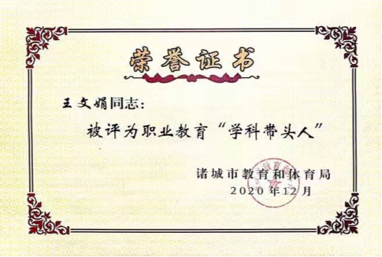 我院教师王文娟和杨翠玲经过充分、精心的准备,在赛课过程中,从教学设计、教学模式、教学方法等方面展示了出扎实的基本功,运用先进的教育教学理念,以学生为中心,采用多种教学方法,借助现代化的教育教学辅助手段,实现了良好的教学效果,被评为2020年诸城市职业教育“学科带头人”。