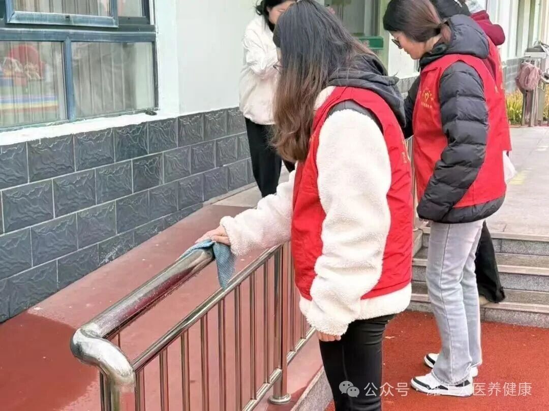 此外志愿者们还开启了幼儿园公共区域的清扫工作,仔细擦拭明亮的窗户、消毒游乐设施的扶手与边角,认真清理地面的杂物与灰尘。他们用双手为孩子们打造了整洁又安全的环境,让小朋友们能在干净舒心的空间里安心玩耍、快乐成长。
