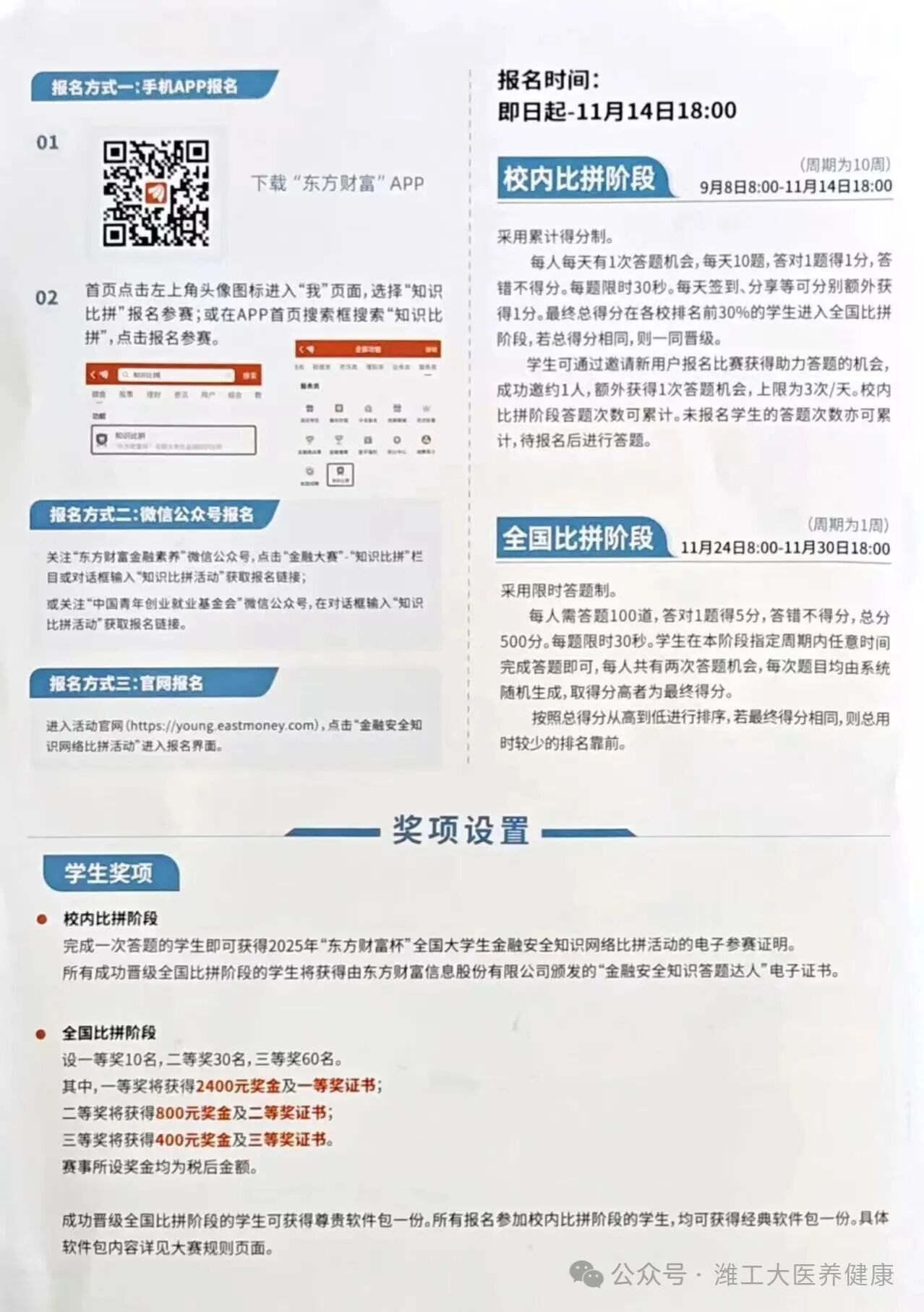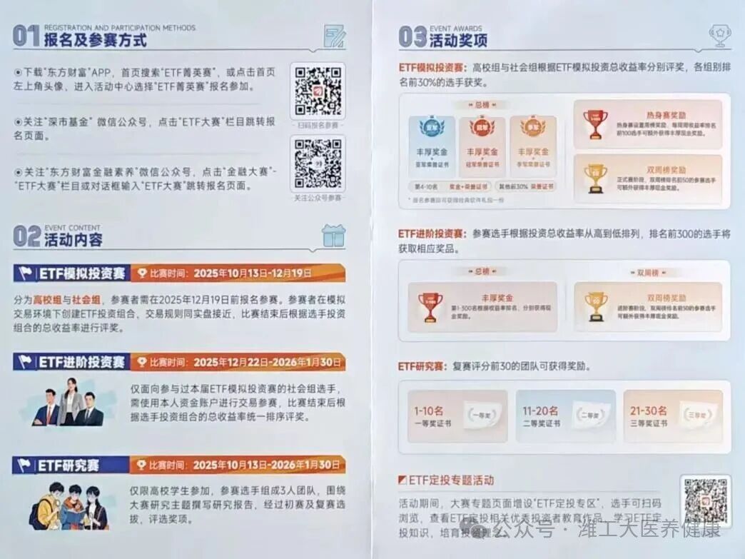 为充分调动参赛积极性,赛事构建了覆盖个人、团队及组织单位的奖励体系,以多元化激励进一步推动金融人才培育工作。赛事期间医养健康学院还将同步开展“ETF知识进百校”活动,通过专题讲座、案例分享等形式普及专业知识,构建“学习-应用-研究”一体化实践生态,助力参赛者提升综合素养。